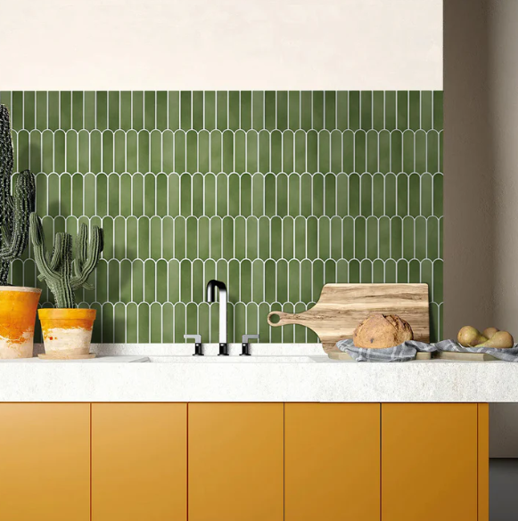 Deep Green fish scale wall tile backsplash, ideal for cozy kitchens