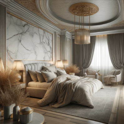 The addition of gold accents and high-quality fabrics against the backdrop of the marble wallpaper introduces a touch of opulence, further elevating the room's aesthetic. This thoughtful integration of elements completes the transformation, culminating in an upscale master bedroom that is as comfortable as it is elegant.