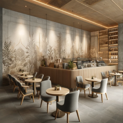 Let's create an image to illustrate the application of stylish and sustainable wallpaper in a modern cafe setting.