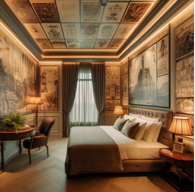 Let's visualize a boutique hotel room enhanced with thematic wallpaper, creating a memorable and unique guest experience.