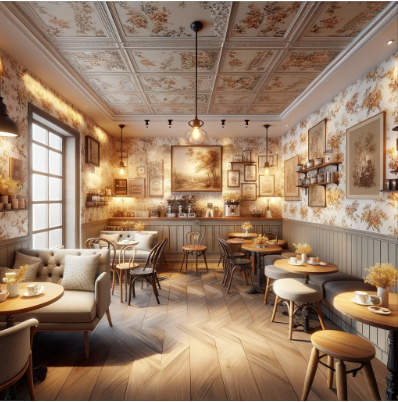 Paired with antique wooden furniture and soft, ambient lighting, the floral-patterned wallpaper significantly enhances the café's vintage appeal. This combination creates an inviting atmosphere that encourages customers to relax and enjoy their surroundings along with their coffee and pastries.
