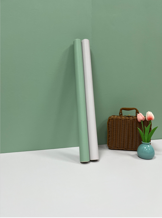 - The two rolls of wallpaper are mint green and light gray.
